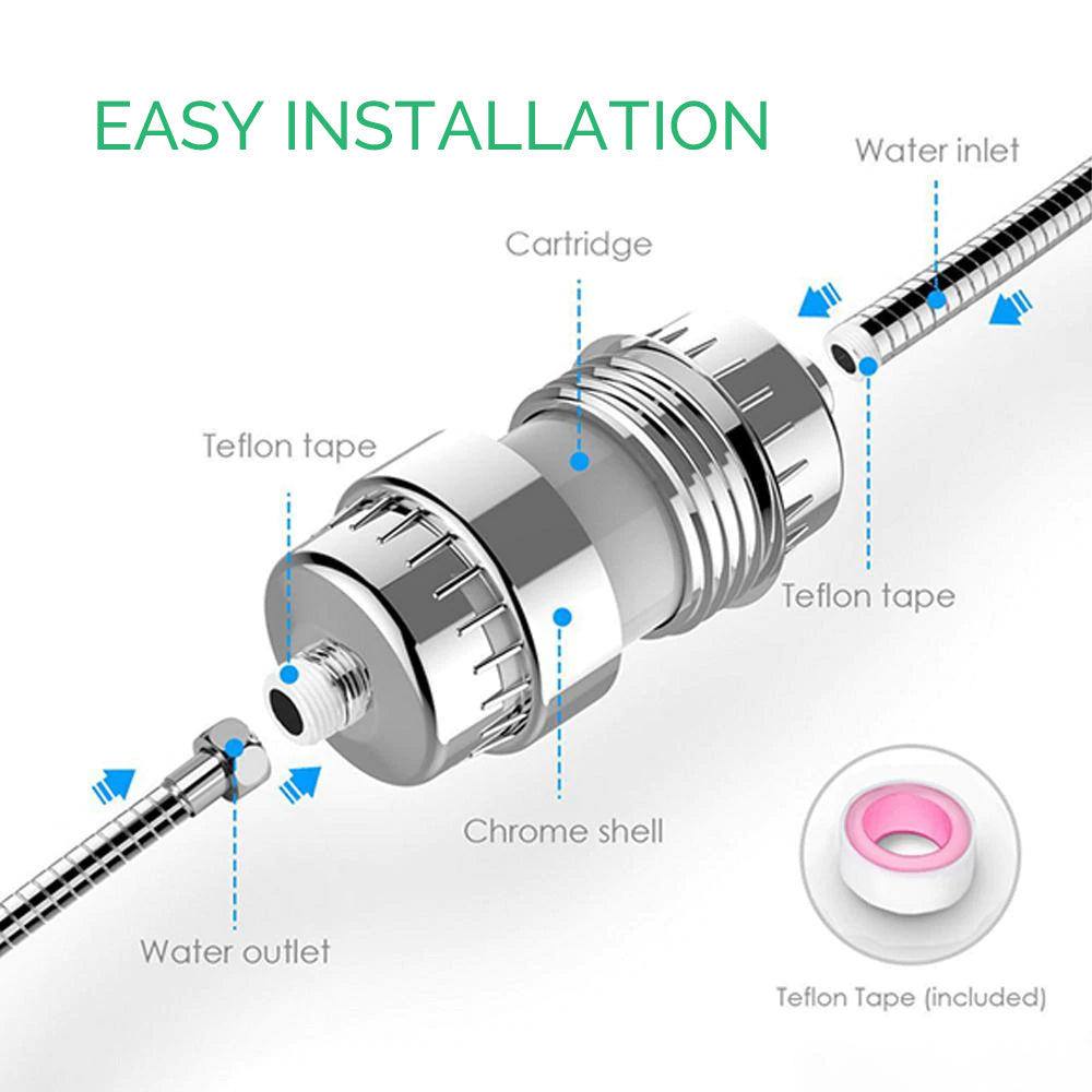 Installer dette dusjhodefilteret for hardt vann enkelt selv. Ingen verktøy kreves, bare en håndstrambar kobling og litt rørleggertape som følger med. Ingen lekkasjer, ingen sprekker. Passer for veggmonterte, håndholdte, regndusj- og kombinasjonsdusjhoder!